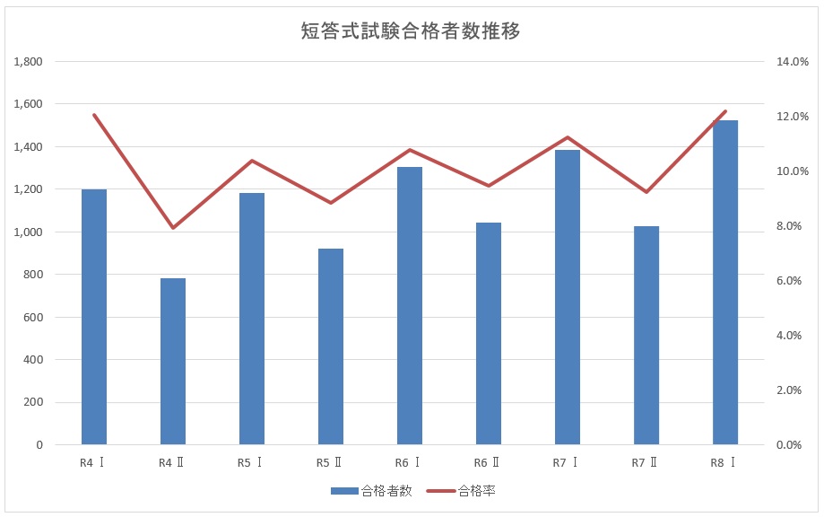 そのような第Ⅰ回試験なのですが、近年の合格者数を見てみるとR5Ⅰが1,182人、R6Ⅰが1,304人、R7Ⅰが1,383人と増加傾向だったものが、今回試験では1,525人と大幅増加しており、依然として高水準で推移する結果となりました。